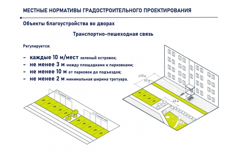 Теперь в новых проектах каждые 10 метров должны быть разделены зеленым островком. Установлена минимальная ширина тротуара во дворе – 2 метра. Расстояние от парковки до входа в подъезд должно быть не меньше 10 метров.