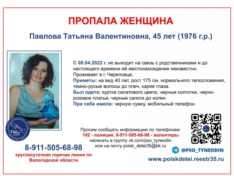 Женщина ростом 175 сантиметров, выглядит несколько моложе своего возраста. Нормального телосложения. У череповчанки темно-русые волосы до плеч и карие глаза. Была одета в куртку салатового цвета, черно-розовое платье, черные колготки, черные сапоги до колен. С собой взяла черную сумку и мобильный телефон.
