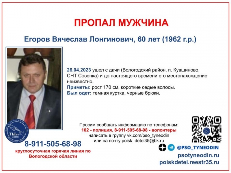 По данным ПСО «Ты не один», мужчина ростом 170 сантиметров, с короткими седыми волосами. Был одет в темную куртку, черные брюки.