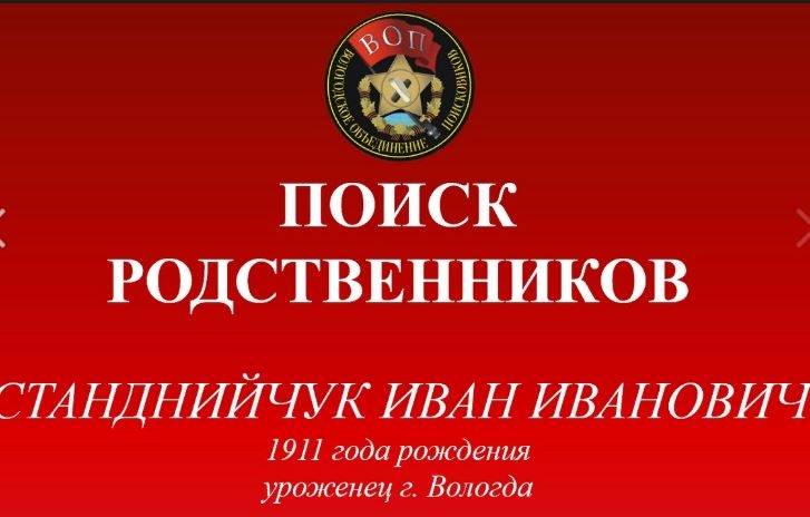 Московский поисковой отряд "Обелиск" обратился к представителям Вологодского объединения поисковиков. Иван Иванович родился в 1911 году. Служил в 256 гвардейском стрелковом полку. До войны жил в Вологде на Набережной Свободы, 62-3. Сейчас это улица мира. Жену звали Станднийчук Нина Васильевна.