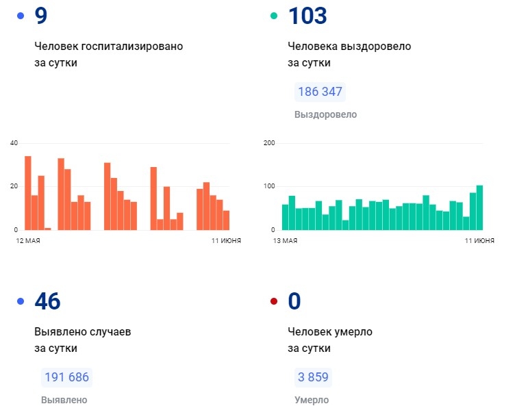За последние сутки выявлено 46 новых случаев ковида. Выздоровели 103 человека. В больницы попали еще 9 пациентов. Данные приводит сайт стопкоронавирус.рф.