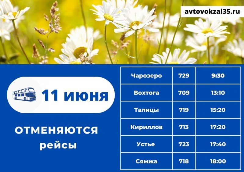 В частности, в связи с предпраздничным днем будут отменены рейсы на Сямжу, Устье, Кириллов, Талицы, Вохтогу и Чарозеро. Эти корректировки будут действовать только один день. Но билет лучше купить заранее, сообщает ИА «СеверИнформ».