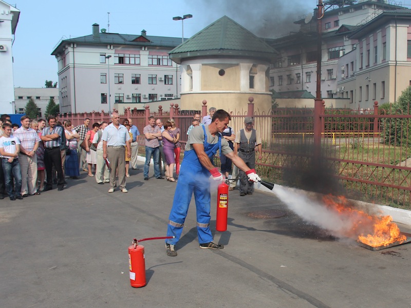 В рамках учений, в которых приняли участие 250 сотрудников сетевой компании, персонал ознакомили с устройством и работой огнетушителей марки ОУ и ОП, а также наглядно продемонстрировали тушение возгорания, которое было специально организовано в безопасной зоне, во дворе здания ИА.