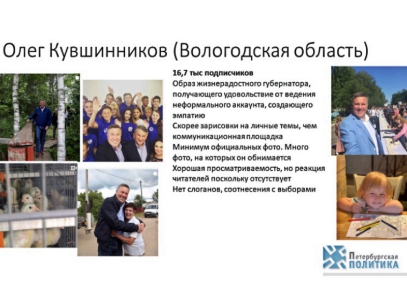 Главу Вологодской области Олега Кувшинникова отнесли ко второй категории. В его аккаунте на момент исследования насчитывалось 16,7 тысячи подписчиков. Сейчас это число выросло до 16,8 тысячи. Аналитики фонда отметили, что создан образ жизнерадостного губернатора, который получает удовольствие от ведения неформального аккаунта и создает эмпатию. Публикации можно отнести скорее к зарисовкам на личные темы, чем назвать коммуникационной площадкой. Так, среди последних публикаций - посты о семье Олега Кувшинникова и о его поездке на рыбалку. Создатели хит-парада обратили внимание на обилие фото с объятиями и минимум официальных снимков. Также отсутствуют слоганы и соотнесение с предстоящими выборами. С одной стороны нет навязчивого напоминания о дне голосования, с другой стороны обозначен курс на продолжение важных дел и после 8 сентября.
