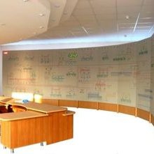 Новый щит имеет мозаичное поле, оживленное с помощью световых индикаторов, а также две дополнительные плазменные видеопанели. Конструкция щита будет специально размещена по периметру служебного помещения дугообразно, чтобы рабочая зона персонала была наиболее комфортной.