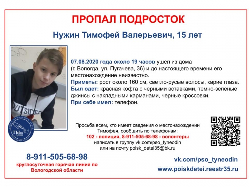 15-летний Тимофей Нужин ушел из дома на улице Пугачева вечером 7 августа. До сих пор его местонахождение неизвестно. К поискам подключились волонтеры.