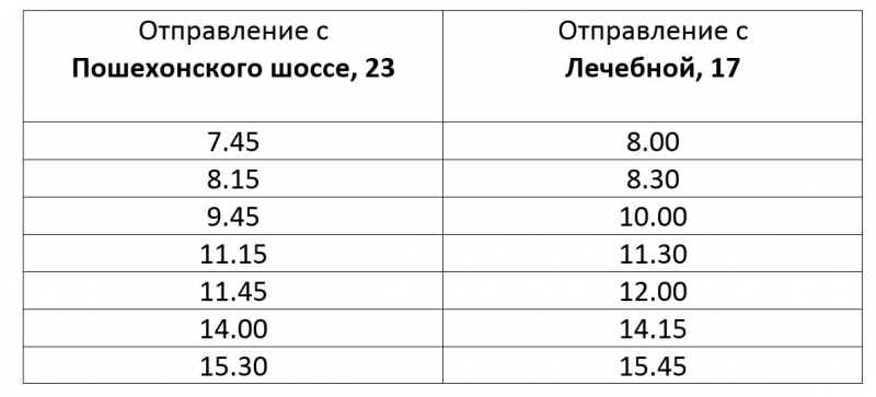 Автобус курсирует между больничными корпусами областной больницы в Вологде на Пошехонском шоссе,23 и улице Лечебной,17. Он следует без остановок. Перевозит пассажиров по будним дням с 8 до 16 часов. Проезд бесплатный для всех.