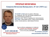 47-летний Вячеслав Смирнов ушел из дома ранним утром 18 октября. Мужчина живет на Северной, 26. До сих пор неизвестно, где он находится. ПСО «Ты не один» распространяет информацию о поиске.