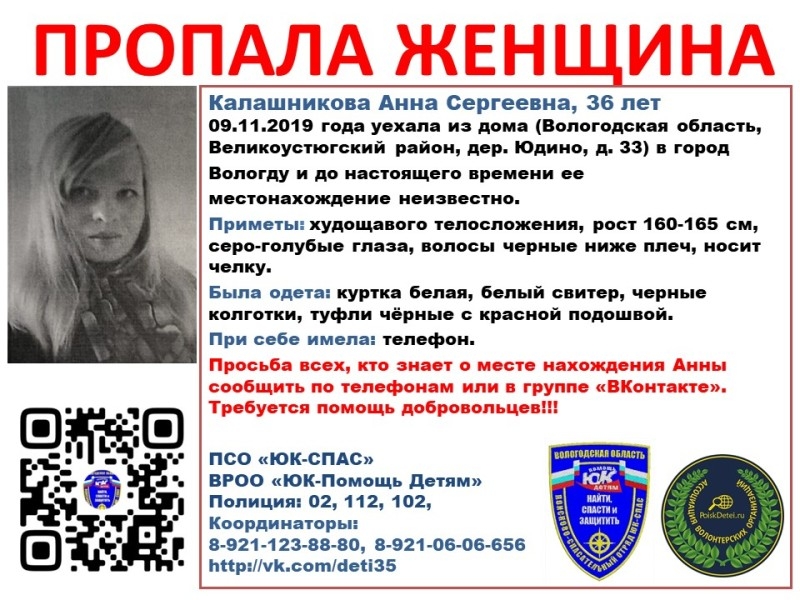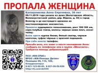 36-летняя Анна Калашникова уехала из деревни Юдино Великоустюгского района, в которой проживала до этого момента, в город Вологду 9 ноября. С тех пор её никто не видел. Родственники женщины забили тревогу, когда та перестала выходить на связь.