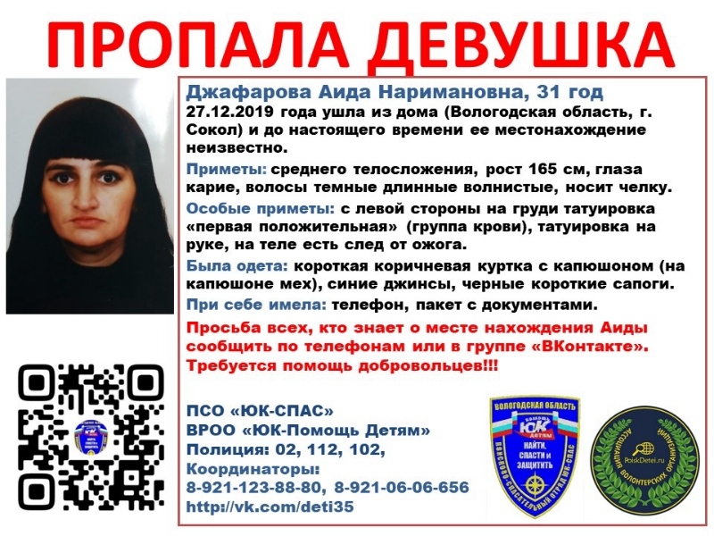 31-летняя жительница Сокола ушла из дома еще 27 декабря. С тех пор о местонахождении Аиды Джафаровой ничего не известно. К поискам подключились волонтеры.