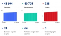 В общей сложности заболели 43694 человек. Уже выписали более 40 тысяч человек. За последние сутки выздоровели 64 пациента с ковидом. Активных случаев заболевания - чуть больше 2 тысяч.