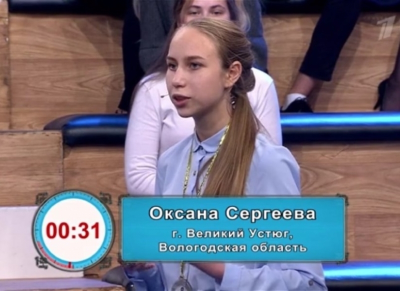 Оксана Сергеева учится в школе № 2 Великого Устюга. В финальной игре она принимала участие в качестве теоретика 1 категории. В итоговое состязание наша землячка попала благодаря игре «шанс». Этот этап дает возможность тем школьникам, кто не прошел дорожки, но заработал ордена и медали.