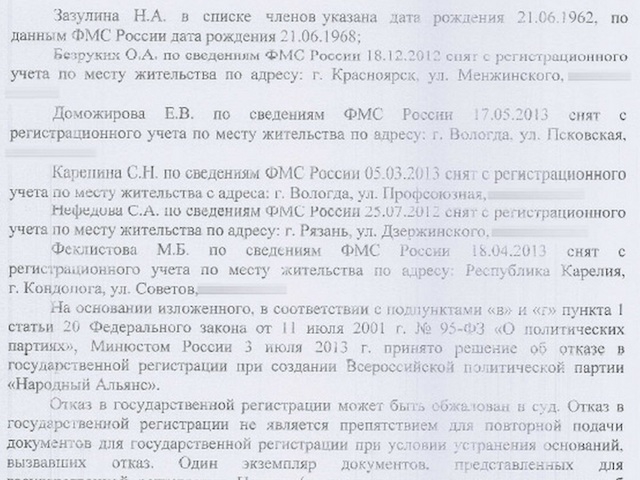 Вологодские активисты «завалили» регистрацию партии «Народный альянс». Неправильные данные регистрации, которые были указаны вологжанами, стали одним из оснований для отказа со стороны Министерства юстиции. Информация об этом появилась на сайте самой партии.