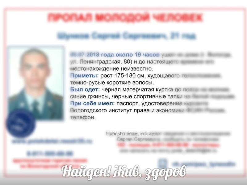 21-летний Сергей Шунков найден живым и здоровым. Накануне вечером его нашли в Вожегодском районе. Юноша шел в сторону дома вдоль железнодорожных путей. Об этом сообщили в региональном управлении Следственного комитета.