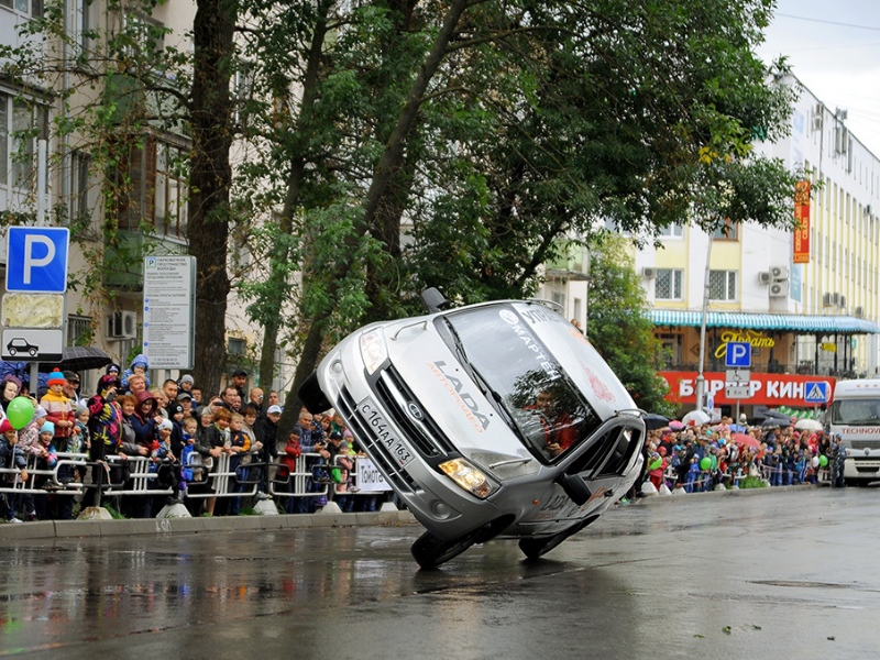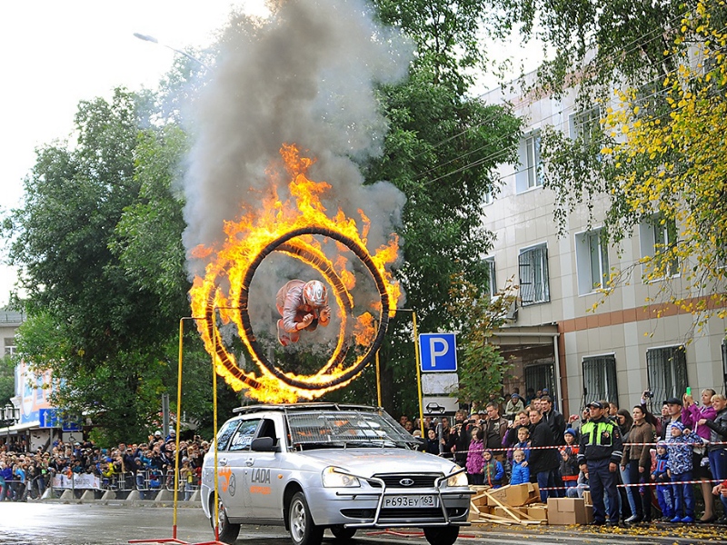 Одним из центральных событий праздника стало автошоу от группы «Тольятти Трюк». Акробаты показали скоростные развороты, езду на двух колесах, трюки с коробками и кеглями, прыжок на полном ходу с крыши автомобиля через огненные кольца.