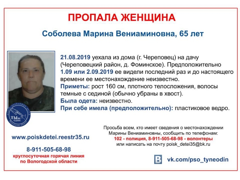 65-летняя Марина Соболева отправилась из города металлургов на дачу в деревню Фоминское. В последний раз женщину видели предположительно 1 или 2 сентября. С тех пор ее местонахождение неизвестно.