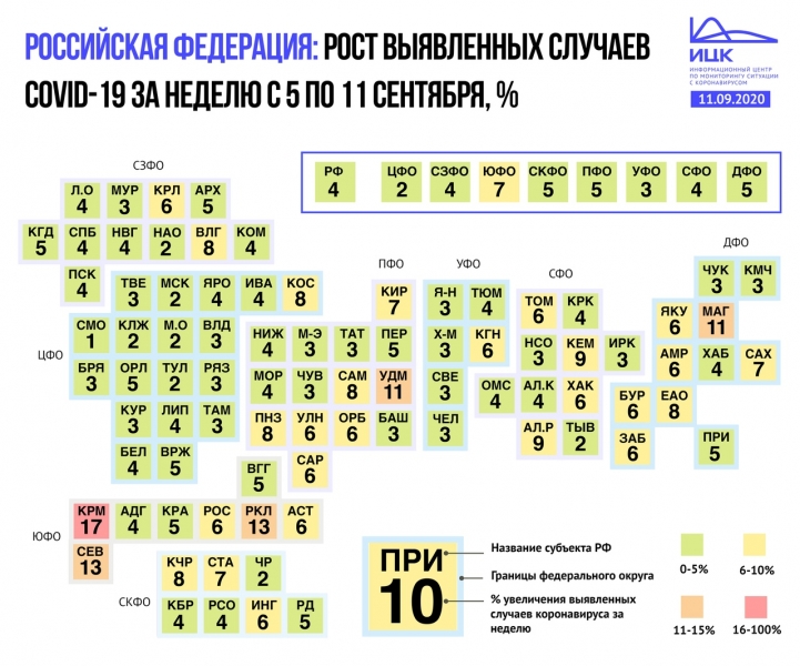 В СЗФО средний показатель составляет 4%, как и в целом по России. Он так же превышен в Карелии, Калининградской и Архангельской области - 6 и 5%. На 4% увеличилось количество заразившихся в Санкт-Петербурге, Ленобласти, Коми, Псковской и Новгородской областях. Немногим ниже прибавка в Мурманской области - 3%. Наименьший показатель в Ненецком АО.