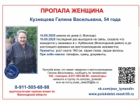 54-летняя Галина Кузнецова ушла из дома в областной столице еще 14 сентября. В последний раз женщина выходила на связь с родными 19 сентября. Тогда она сказала, что находится в гостях в селе Кубенском Вологодского района.