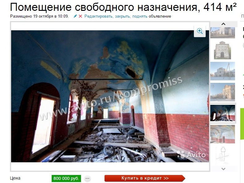 По словам специалистов агентства недвижимости, они не сочли уместным вывешивать на здание даже баннер о продаже, все-таки по всем признакам это церковь, хоть и числится как нежилое помещение.