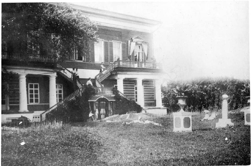 Архитектурная группа из трех цветочных клумб, двух тумб с вазонами и стелы с зеркальным шаром была расположена возле юго-восточного фасада главного дома.