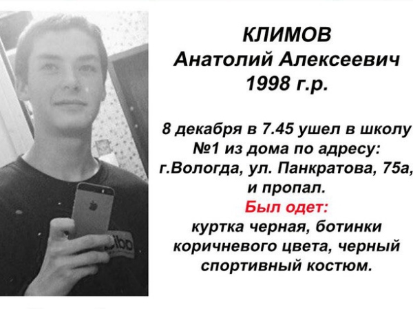 Напомним, что 16-летний Анатолий Климов пропал еще 8 декабря. Мальчик ушел в школу, но домой не вернулся. Больше четырех суток о его местонахождении ничего не было известно. Родственники обратились в полицию. Также к поискам подключились волонтеры.