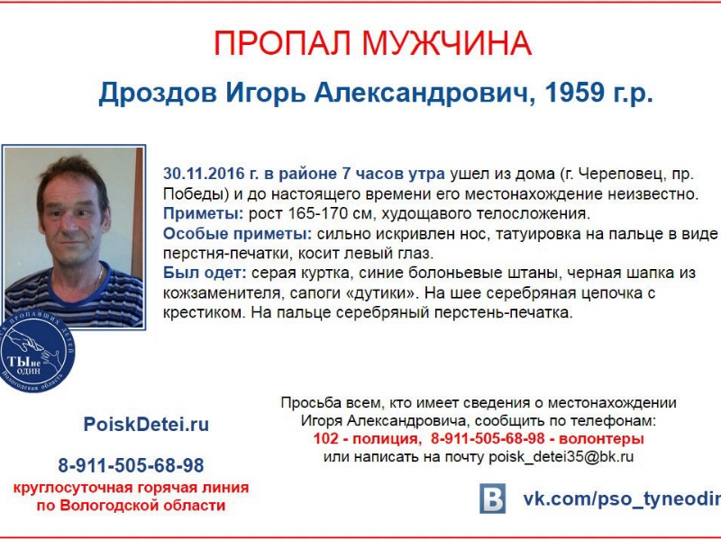 Всех, кто располагает информацией о местонахождения Игоря Дроздова, просят позвонить в полицию по номеру 02 или волонтёрам по телефону 89115056898.