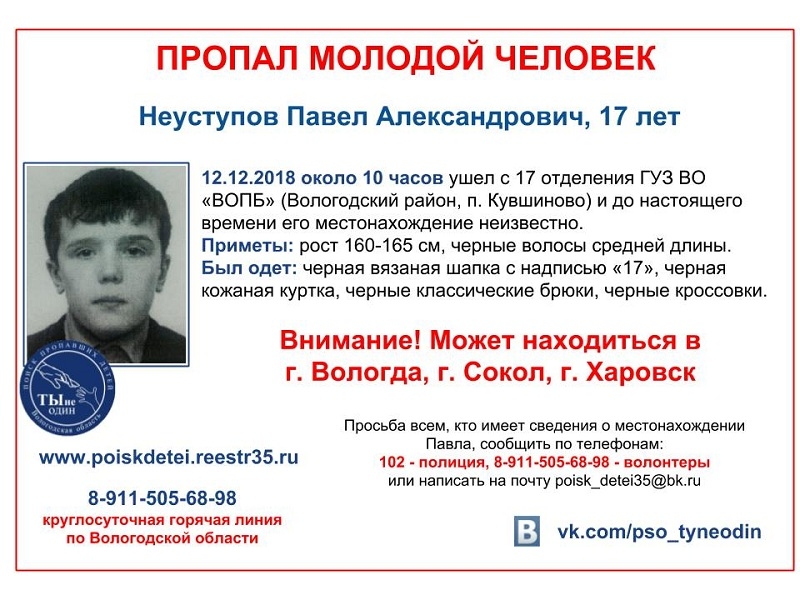 Всех, кто что-то знает о местонахождении Павла Неуступова, просят позвонить по номеру полиции 102, либо на горячую линию волонтеров ПСО: 8911-505-68-98, также можно написать на электронную почту poisk_detei35@bk.ru, сообщает ИА «СеверИнформ».