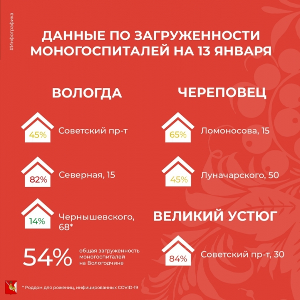 В основном моногоспитале Череповца на Ломоносова загрузка составляет 65%. Моногоспиталь на базе роддома на Луначарского заполнен на 45%.