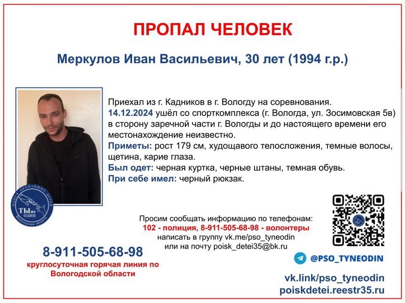 Последний раз Ивана Меркулова видели 14 декабря. Он вышел из спорткомплекса и пропал. Его приметы: худой, высокий, на лице щетина. Был одет во все черное, с собой был рюкзак.