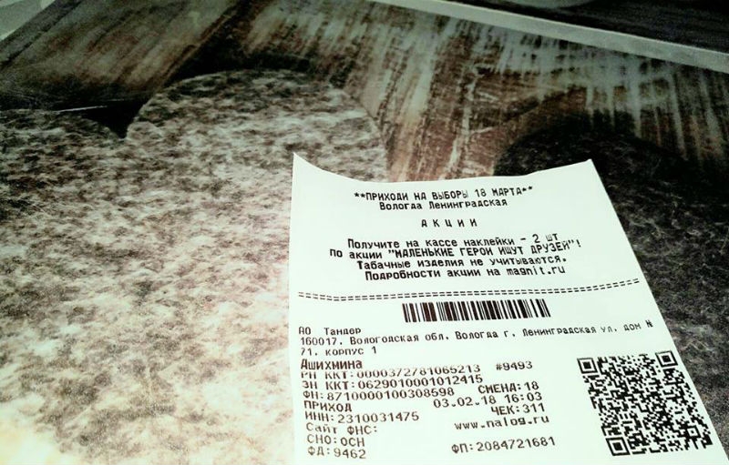 Тут же на данную фотографию отозвались коллеги газеты «Череповецкая истина». Портал пишет, что управление экономической политики Череповца разослало предпринимателям письмо, в котором просило выбрать, где владельцы магазинов будут размещать рекламу предстоящих выборов: на чеках или фирменных пакетах. Ответ нужно было дать до 7 февраля. Так что в ближайшем будущем слова «Все на выборы 18 марта!» появятся и в Череповце.