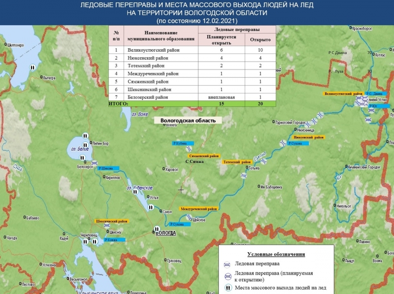 Больше всего переправ организовано в Великоустюгском и Нюксенском районах - 10 и 4 соответственно. Еще 2 места отведено в Тотемском районе, по одному - в Шекснинском, Белозерском, Междуреченском и Сямженском районах.