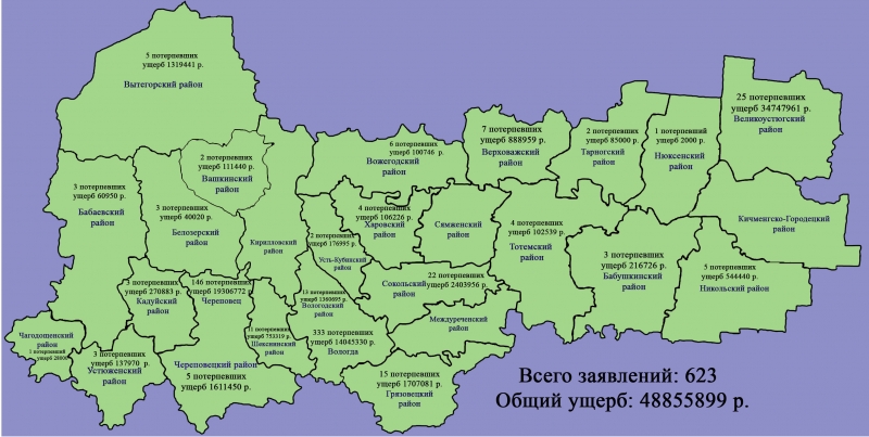 Среди районов наибольший ущерб в Великоустюгском - 3,4 миллиона рублей. Сбережений лишились 25 человек.