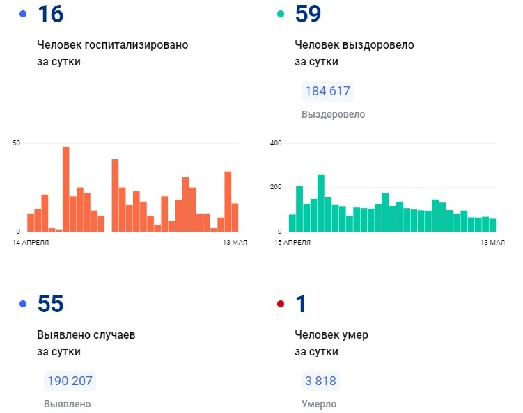 Выздоровели за сутки 59 пациентов, всего – более 184,6 тысячи. Выявлено еще 55 случаев заболевания, в общей сложности за всё время пандемии положительный тест получен свыше 190 тысяч раз.