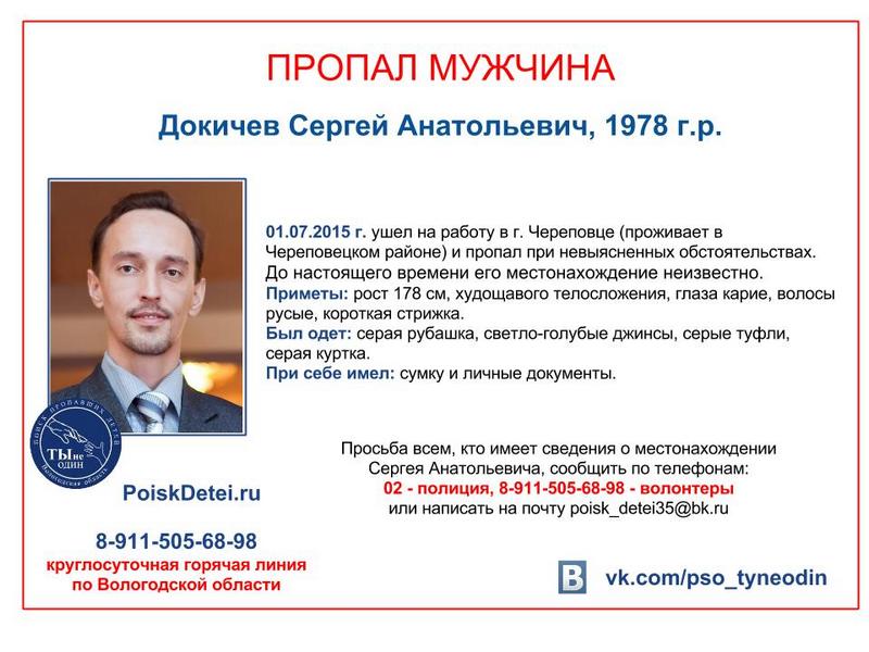 В Череповце разыскивают мужчину. 37-летний Сергей Докичев ушел 1 июля на работу и пропал. Обстоятельства исчезновения неизвестны.