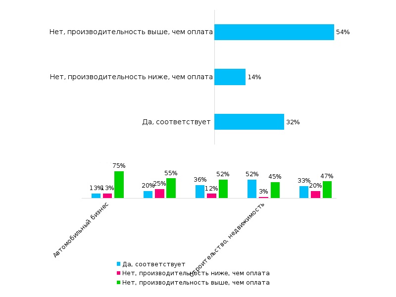 Больше всего респондентов ответивших, что производительность труда в их компании превышает оплату, работают в сфере автомобильного бизнеса - 75%. О соответствии производительности труда оплате заявили больше половины - 52% - работников сферы строительства и недвижимости. Доля тех, кто указал на то, что в их компании оплата труда превышает производительность, больше всего в сфере информационных технологий - 25%.