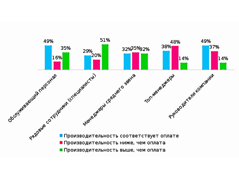 Исследование показало, что в большинстве компаний - 54% опрошенных - производительность труда, по мнению менеджмента выше, чем оплата. Треть руководителей отметили, что производительность труда соответствует оплате, и лишь 14% указали, что, по их мнению, производительность ниже и оплата ей не соответствует.