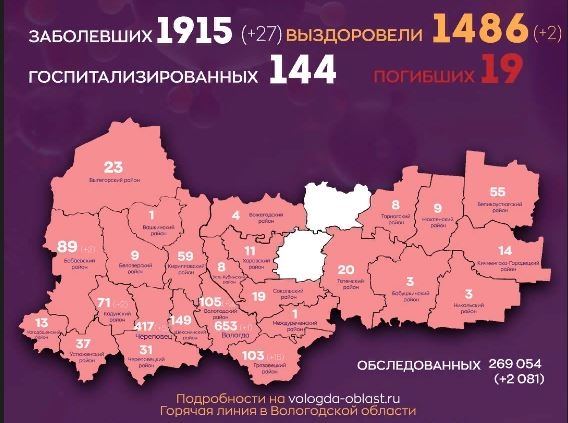 За минувшие сутки в Вологодской области выявлено 27 новых случаев. 5 в Череповце, по 2 в Вологодском, Кадуйском и Бабаевском районах. В Вологде один новый инфицированный. Всего в регионе 1915 заболевших, 1486 выздоровели, из них 2 за сутки.
