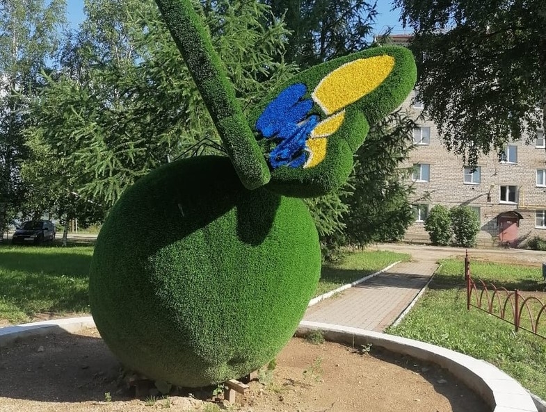 Объектом нападок периодически становится яблоко с бабочкой. Топиар установлен в центре поселка. Раньше хулиганы выщипывали яблоко, теперь их привлекает верхняя часть фигуры.
