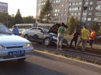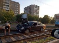 Автомобиль вылетел на рельсы в Череповце. Из-за этого было затруднено движение трамваев.