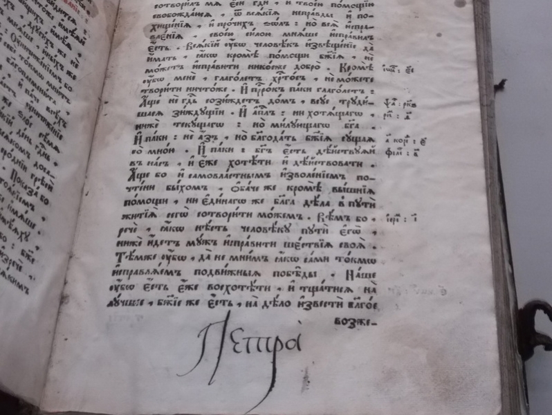 «Выставка дает возможность увидеть предметы допетровской эпохи из коллекции Кирилло-Белозерского музея-заповедника: отреставрированную серебряную ладаницу 1609 года, икону «Кирилл Белозерский и Сергий Радонежский» XVII века, жалованную грамоту царя Алексея Михайловича архимандриту Кирилло-Белозерского монастыря Никите, а также памятники, связанные не только с эпохой Петра Великого, но и лично с ним – например, герб Российской империи 1722 года, который был изготовлен специально к приезду Петра Алексеевича; рукопись «Отписка вологодского посадского человека Сергея Филиппова великому государю царю и великому князю Петру Алексеевичу» от 6 июля 1708 года, а также «Евангелие учительное воскресное» 1697 года», – рассказал куратор выставки, заместитель генерального директора Кирилло-Белозерского музея-заповедника Алексей Смирнов.