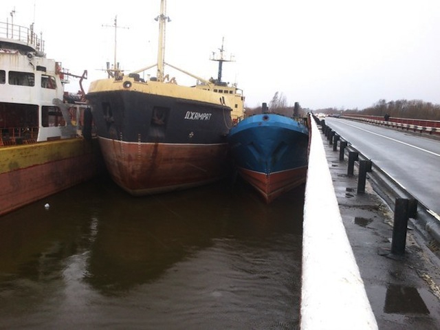 В мост на подъезде к городу Северодвинску Архангельской области врезались сразу шесть теплоходов. В 13:30 в воскресенье, 13-го октября, их оторвало ветром с причала и вынесло прямо на переправу.