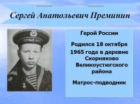 Сергей Преминин погиб в 1986 году в Саргассовом море при выполнении боевого задания. Когда в одном из отсеков подводной лодки вспыхнул пожар, наш матрос вручную заглушил ядерный реактор. После чего не смог выйти из отсека. Указом Президиума Верховного Совета СССР от 22 июля 1987 года за мужество и отвагу Сергей Преминин был посмертно награжден орденом Красной Звезды, а в 1997 году герою присвоили звание Героя России, сообщает ИА «СеверИнформ».