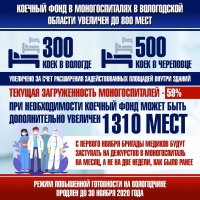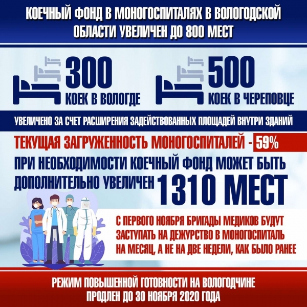 По информации губернатора, в настоящее время моногоспитали заполнены на 59%. Однако, в правительстве региона обсуждается возможность при необходимости расширить фонд еще до 1310 мест, сообщает ИА «СеверИнформ».
