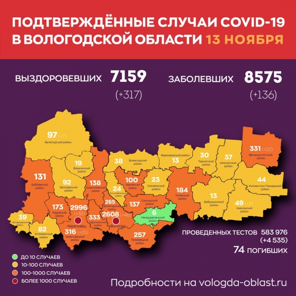 За все время пандемии в области – 8575 случаев. За день поправились 317 вологжан, 4535 человек сдали тесты.