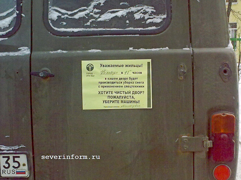 Чтобы на объявления обратили внимание владельцы машин, представители управляющих компаний не только клеят их на двери подъездов, но и рассовывают под дворники припаркованных автомобилей. «Эта машина во дворе давным-давно стоит и мешает снегоуборочной технике. Дворников у неё нет, поэтому мне ничего не оставалось делать, как наклеить объявление на сам автомобиль», - говорит мастер по устройству УК «Теплосервис» Татьяна Молчанова.
