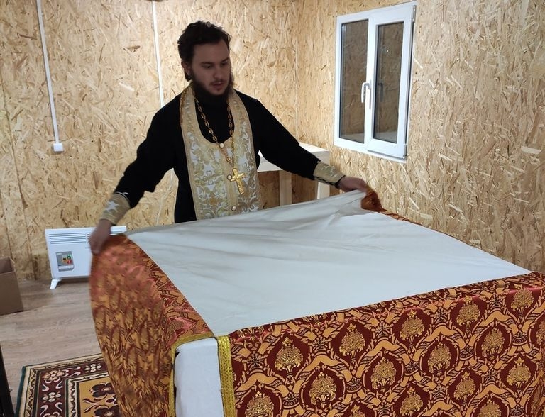 Построить временное здание помогли попечители храма. Конструкцию собрали из блок контейнеров на заранее подготовленном фундаменте. Причем, сделано было это в два раза быстрее чем обычно. Настоятель храма вместе рабочими трудился над устройством здания. Последние работы были закончены перед праздником Рождества. Помогали и прихожане: они приносили необходимую мебель и предметы и помогали украшать внутреннее пространство.