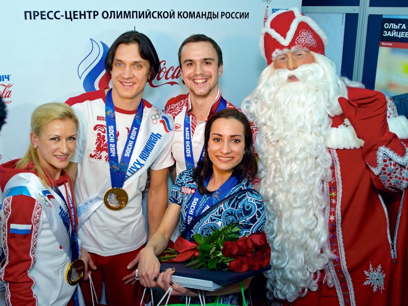 Дед Мороз поздравил Олимпийских чемпионов Максима Транькова и Татьяну Волосожар, а также Ксению Столбову и Федора Климова, которые получили серебряную медаль. Чествование наших фигуристов состоялось вечером в четверг, 13 февраля, в Доме болельщиков сборной России в Сочи.