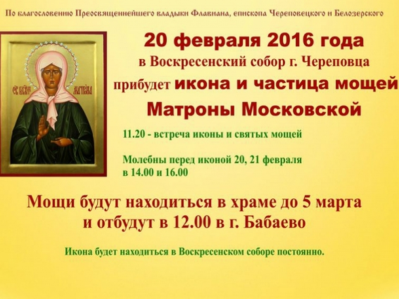Верующие череповчане смогут прикоснуться к иконе Матроны Московской. Образ и частица мощей прибудет в Воскресенский собор Череповца 20 февраля.