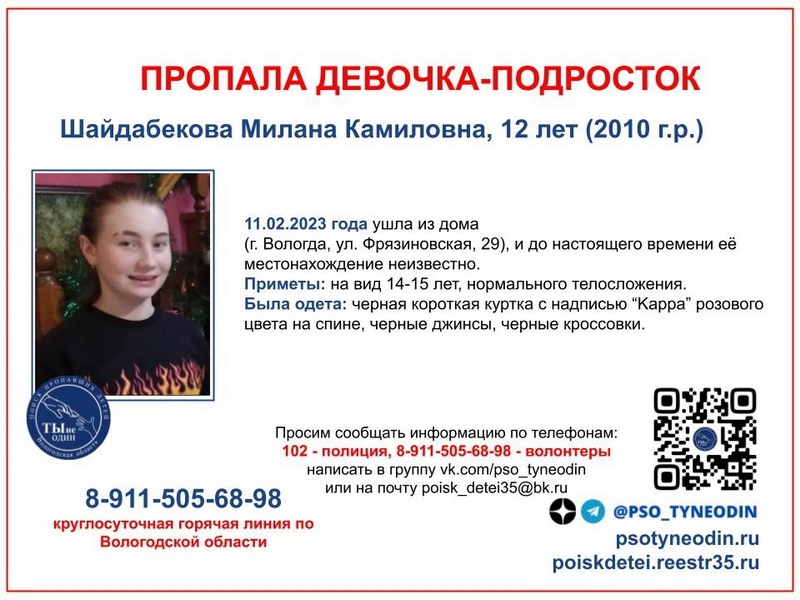 Девочка живет в Вологде на улице Фрязиновской. На данный момент о месте ее нахождения ничего не известно.
