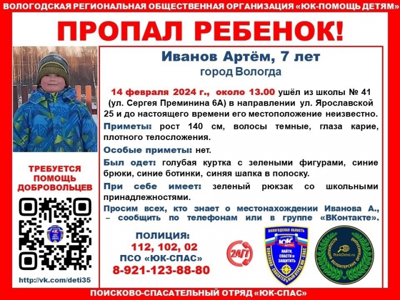 Всем, кто может помочь в поисках, просьба обратиться в полицию или к волонтерам, сообщает ИА «СеверИнформ».